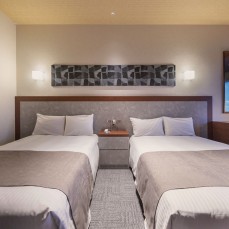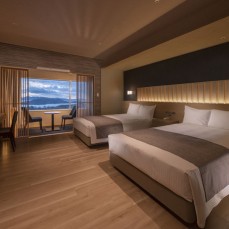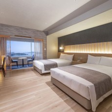 <4階>ツインルーム 28.5平米/オーシャンビュー/建物の一部が視界に入る場合もありますが眺望を遮るものではございません。/ベッドはセミダブルサイズ2台設置 ※<4階>広縁付ツインとコネクト可能※