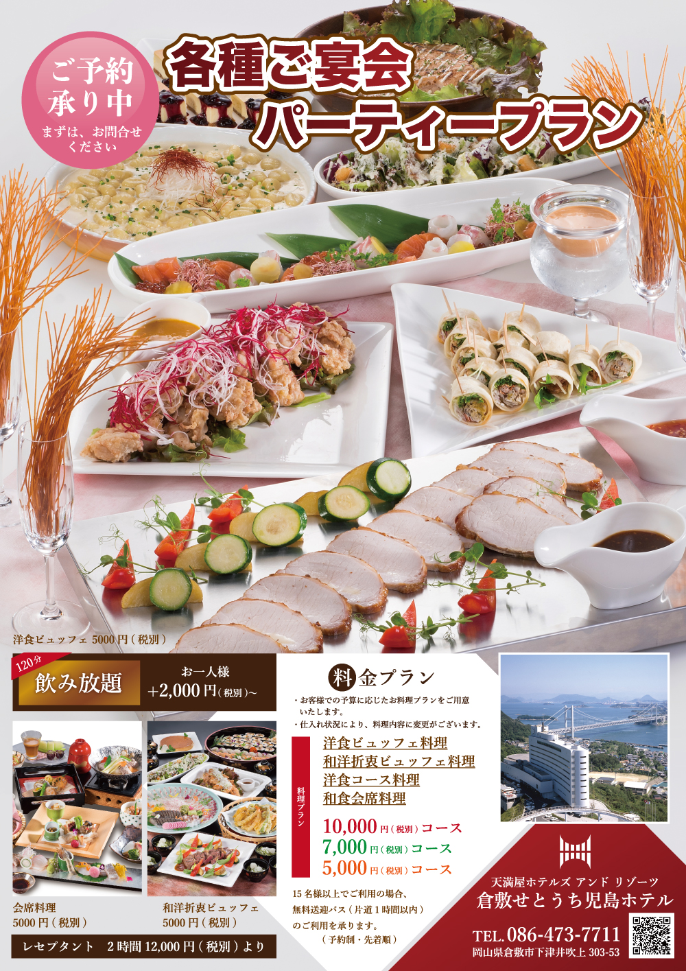 各種パーティー、会議・会合などご要望に合わせたレイアウトは勿論、季節や目的に合わせた宴会プランを各種ご用意いたしております。