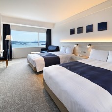 <4階>ツインルーム 28.5平米/オーシャンビュー/建物の一部が視界に入る場合もありますが眺望を遮るものではございません。/ベッドはセミダブルサイズ2台設置 ※<4階>広縁付ツインとコネクト可能※
