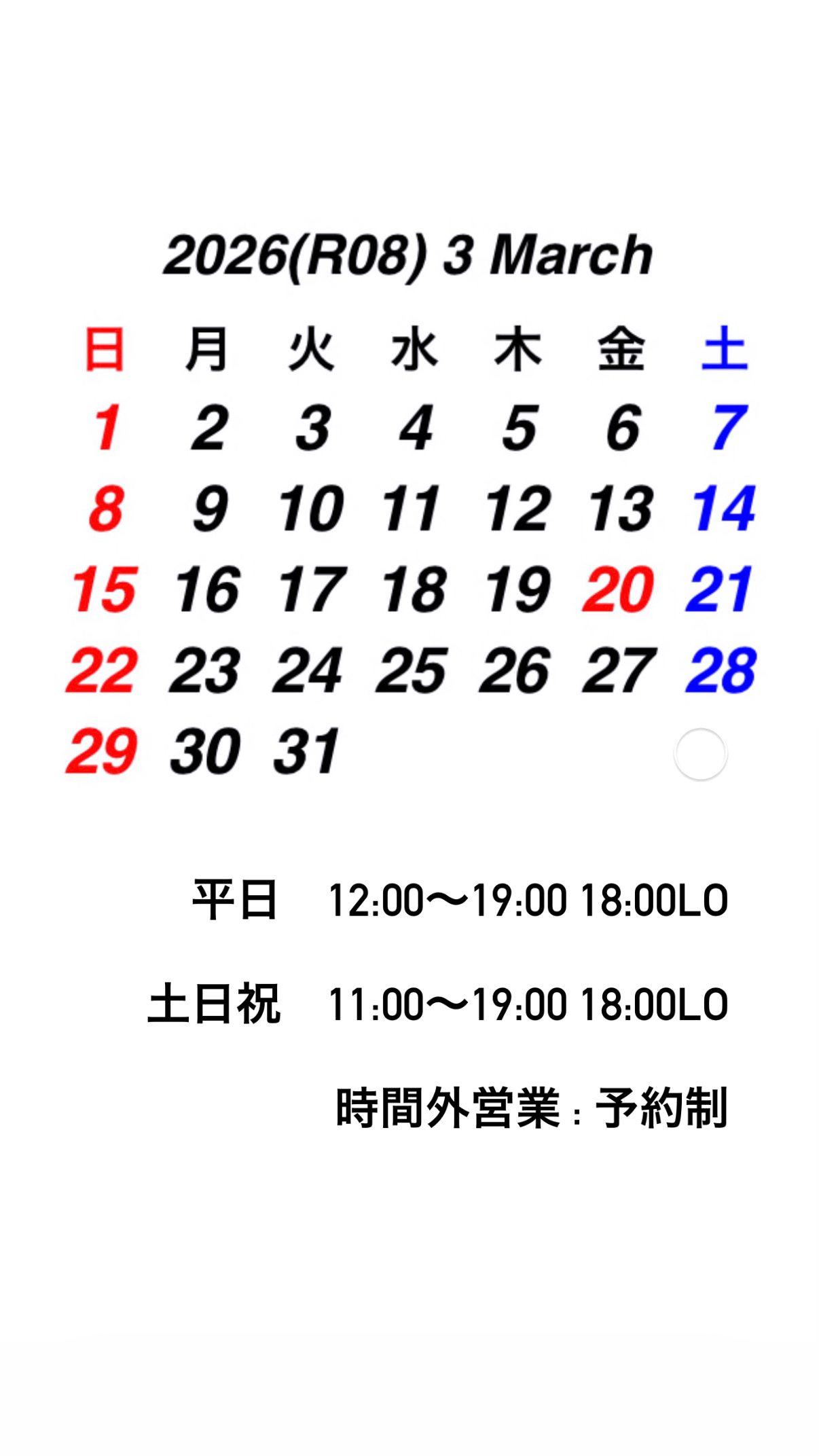| 休業日 | 不定休(月替わり) ※下記カレンダーをご確認ください※ |
