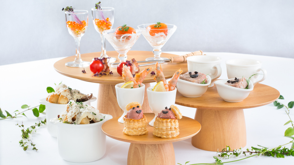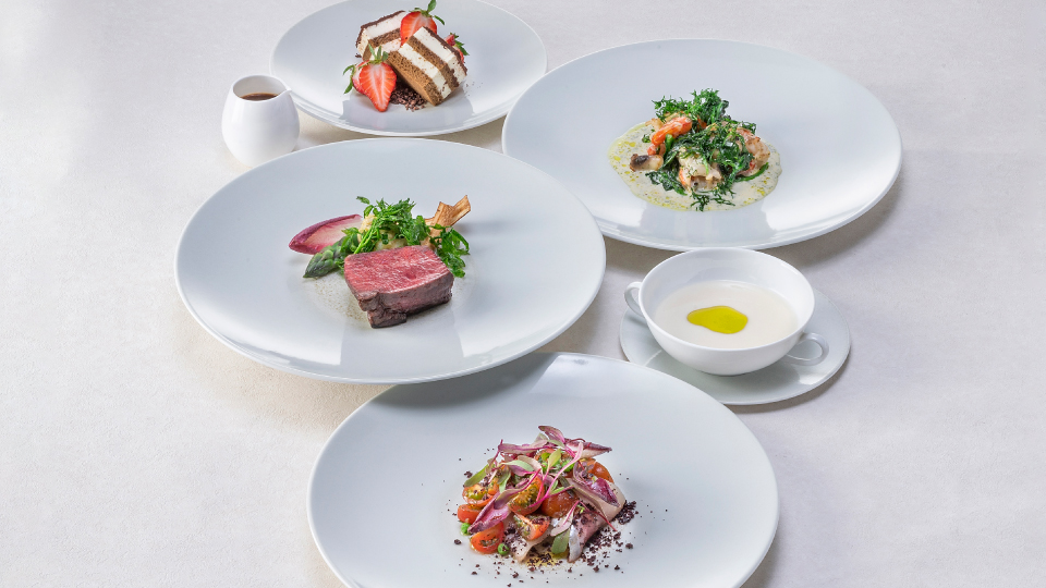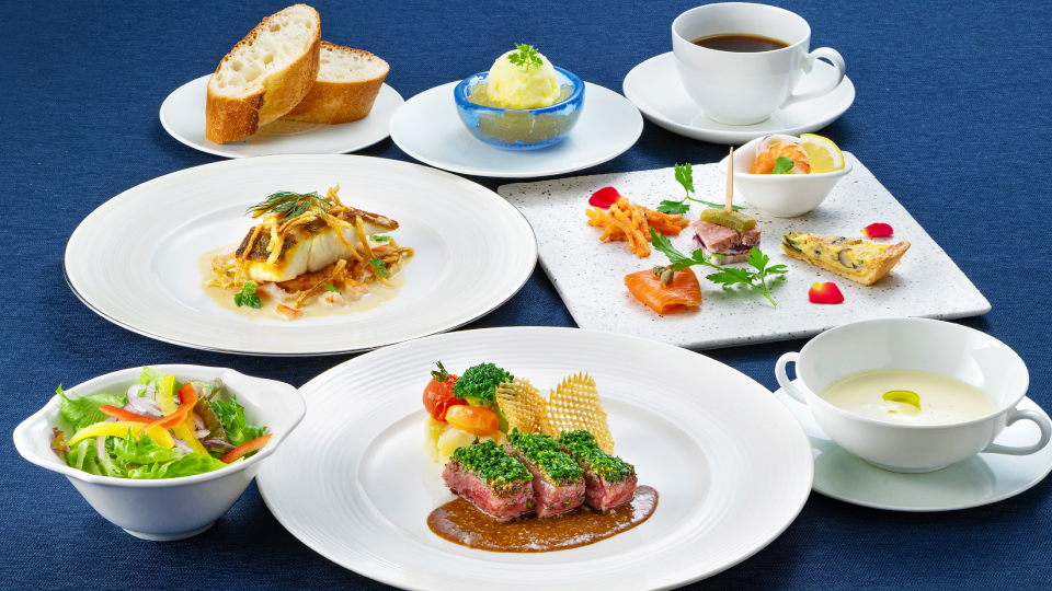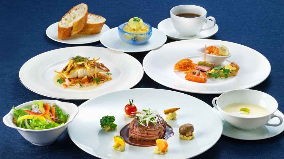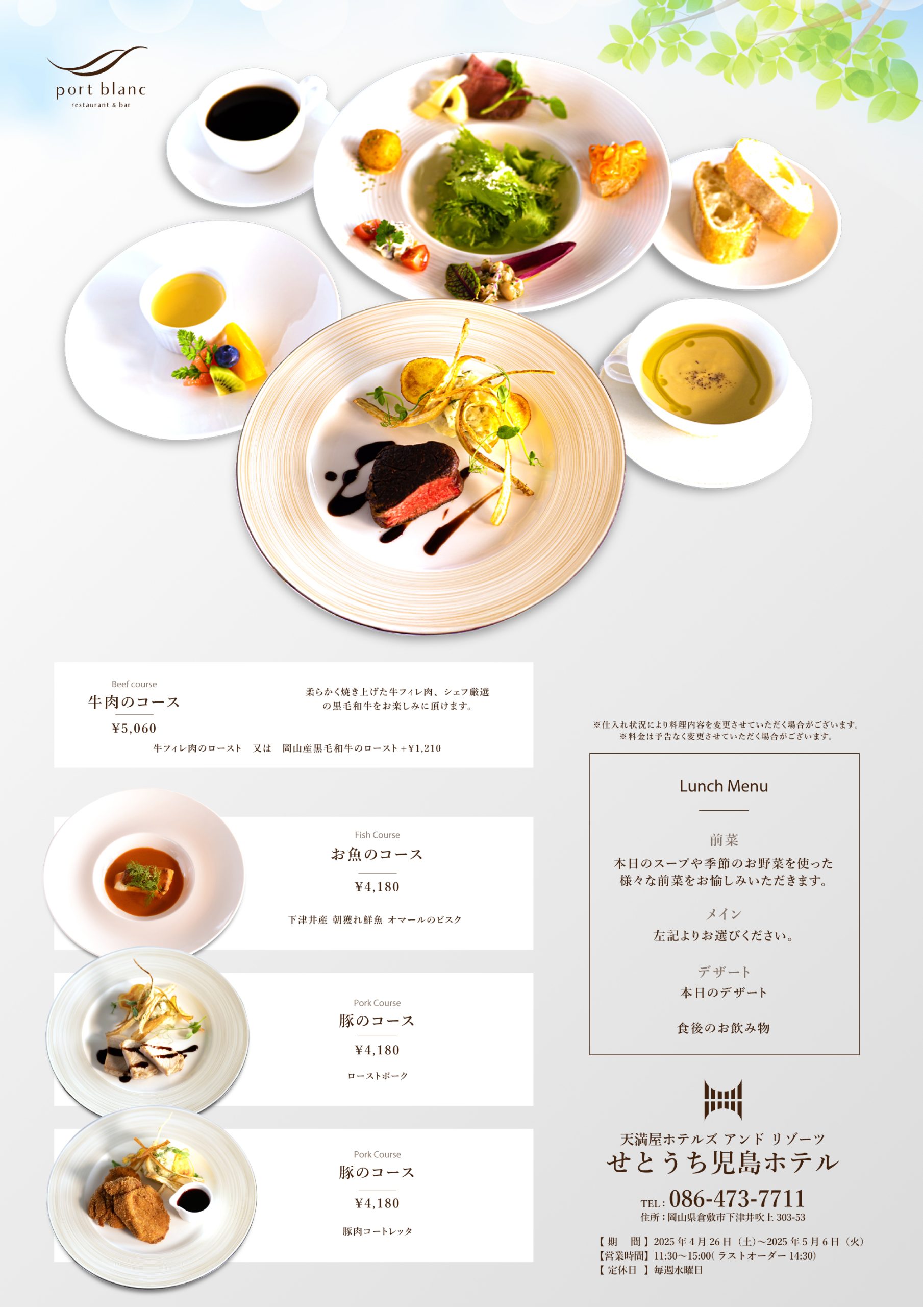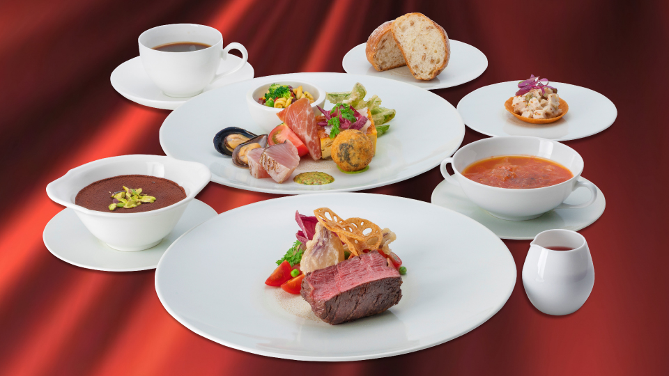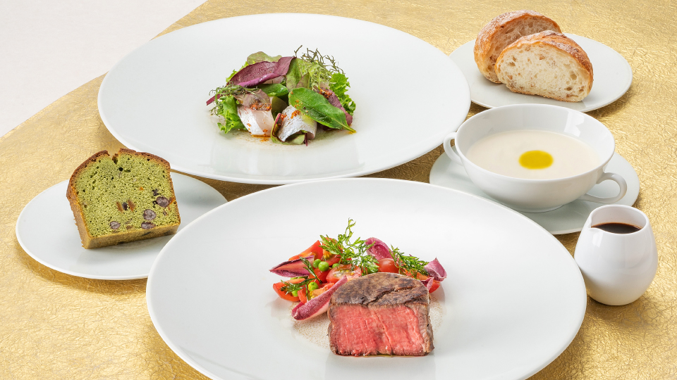 季節の海の幸山の幸を前菜に仕立てております。メイン料理はシェフが選んだ岡山県産の食材を中心にご用意いたしました。