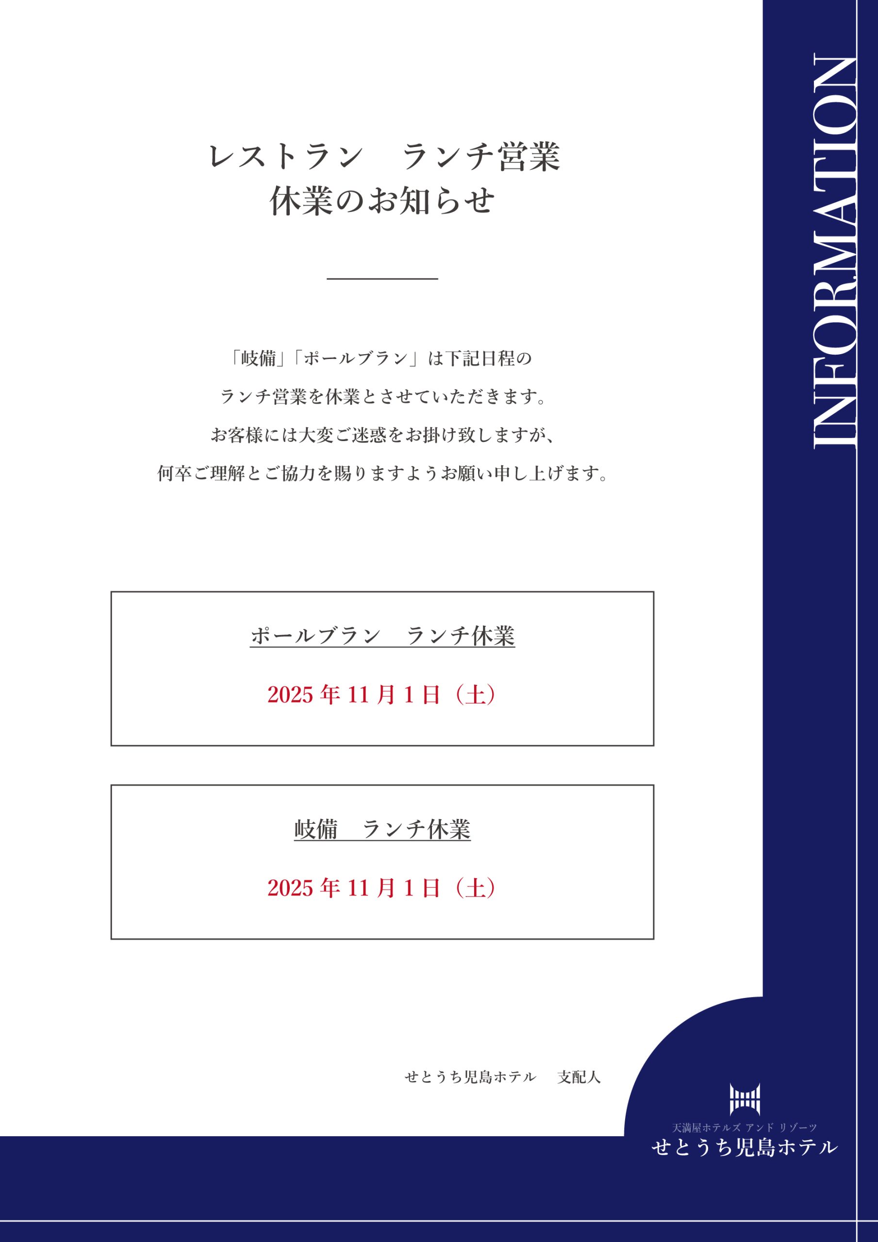 【11月1日】レストラン ランチ営業 休業のお知らせ